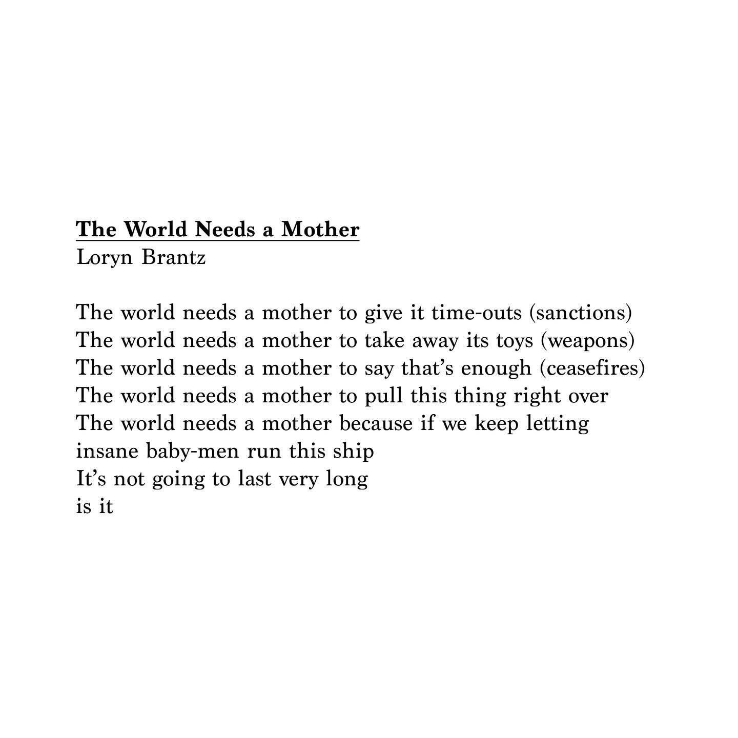 This poem speaks directly to the chaos of our times. Leaders act like children throwing tantrums with dangerous toys, and it is the people — the planet — who suffer the consequences. What Brantz names here is not just frustration but a call to balance: the world needs the Mother archetype.